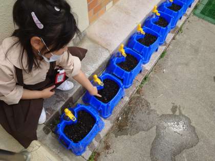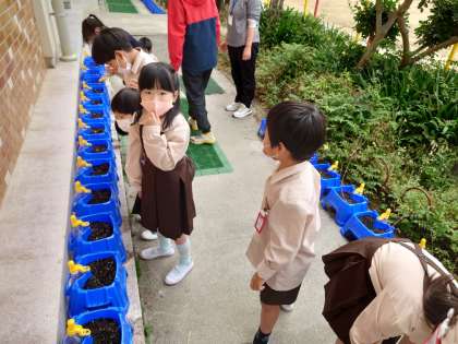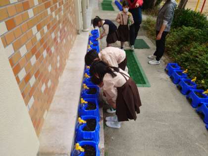 1年生が鉢植えに水をあげていました。アサガオの芽が出ている鉢もありました。