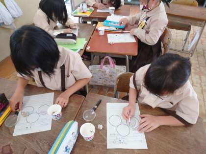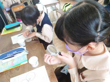 3年生が生活をしていました。ひまわり、ホウセンカ、マリーゴールドの種を虫めがねで観察していました。