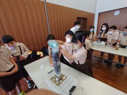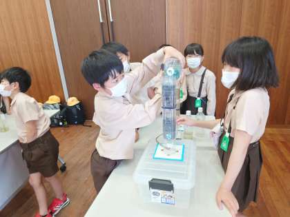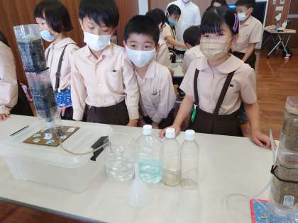 続いて青い水を粒状活性炭の中に注いでいきます。色がなくなり透明になりました。