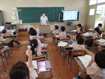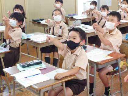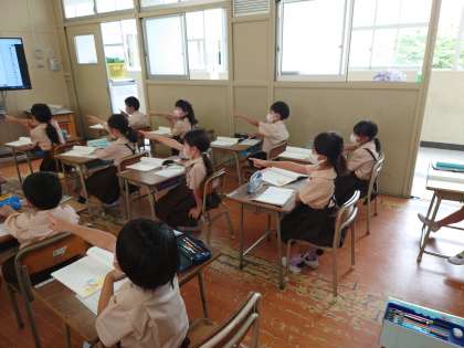 2年生が国語をしていました。担任の先生をキツネに見立てて、それあたしの帽子よと指を指して言っていました。