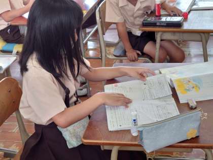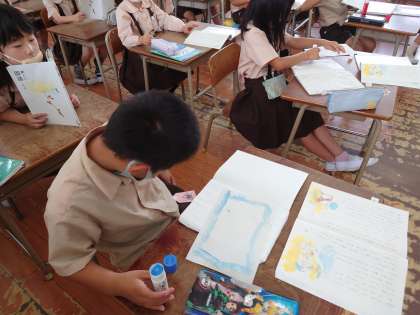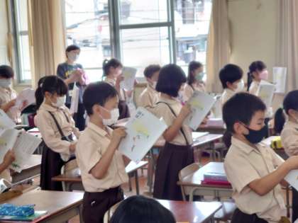 2年生が国語をしていました。プリントを貼ったあと、名前を見てちょうだいの音読をしていました。