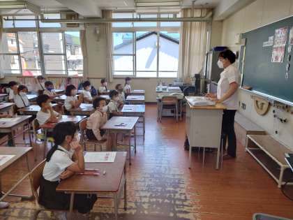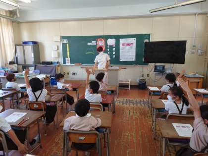 今日は教育委員会から歯科衛生士さんに来ていだいて歯の大切さについて話をしていただきました。