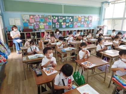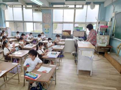 1年生が音楽をしていました。みんなカスタネットを使って楽しそうです。