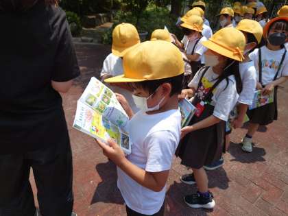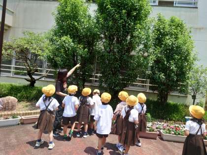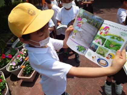 1年生が校門で草木の観察をしていました。みんな本を片手にしっかり見比べていました。