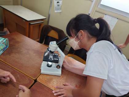 6年生が理科をしていました。じゃがいもの葉っぱを顕微鏡で観察していました。