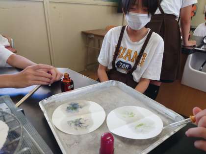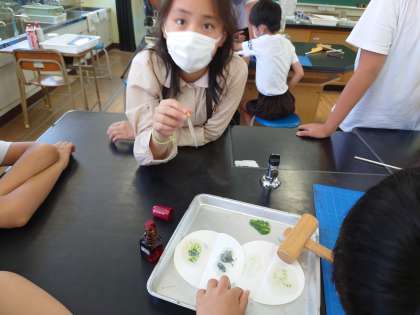 日光があたっているじゃがいもの葉とあたっていない葉をゆでて、叩いたものにヨウ素液をかけていました。青紫になっているのは日光があたっている方です。