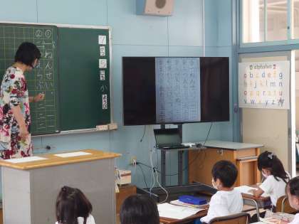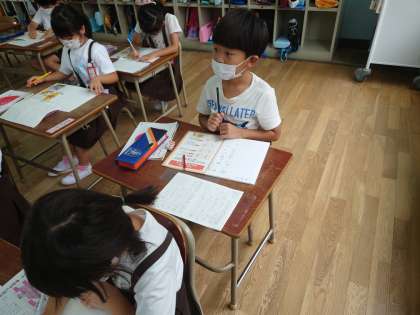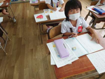 1年生が国語をしていました。初めての漢字ノートを書いていました。