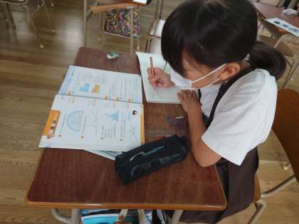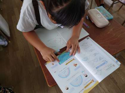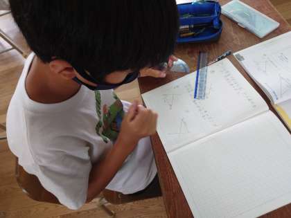 4年生が算数をしていました。分度器や定規を使って三角形をかいたり、角度を測ったりしていました。