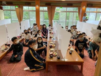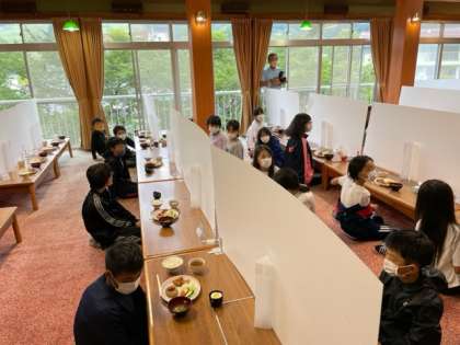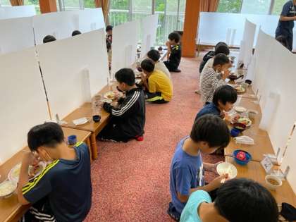 夕食が始まりました。感染対策のためパーテーションで区切っていただいています。みんな元気でしっかり食べています。