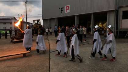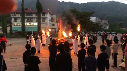 火の神、火の子の登場、点火をし、キャンプファイヤーが始まりました。