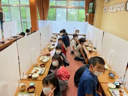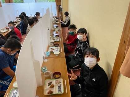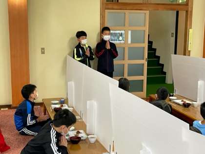 林間学習、最期の朝食です。全員揃って、いただきます。一日の活動の源です、しっかり食べましょう。
