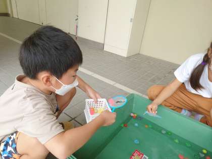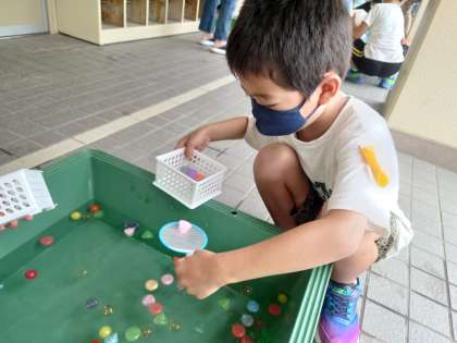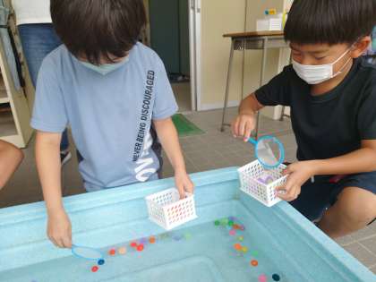 夏休み緊急企画、今日は教室前でヨーヨー釣りとスーパーボールすくいを行いました。