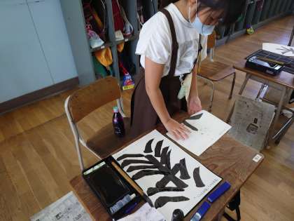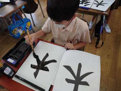 3年生が習字をしていました。はらいの練習です。片付けも上手にしていました。