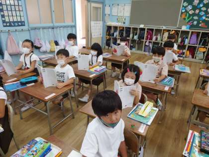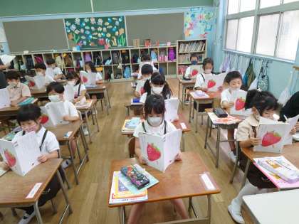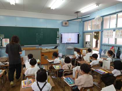1年生が国語をしていました。かいがらという単元を音読していました。