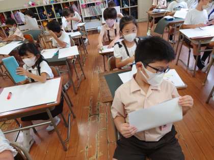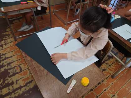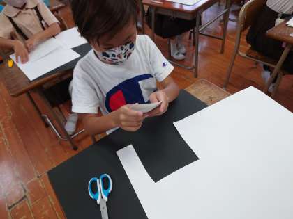 今日は2年生二学期初6時間目まであるので、両クラスとも昼からは図工、ハサミのアートに挑戦します。