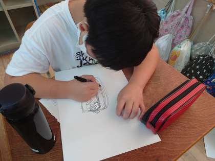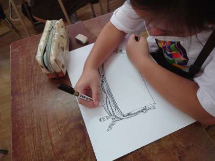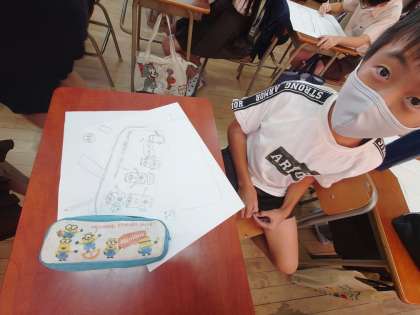 6年生が図工をしていました。。自分の持ち物、筆箱やランドセルをかいていました。