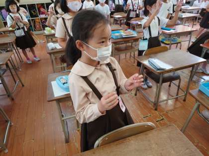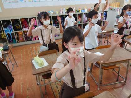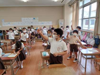 2年生が教室で活動していました。体育でシナプソロジーという活動があります。運動に関係した脳を活性化させる活動。考えながら自分の体を意図通りに動かし、自然とできるようになることを目指しています。今日は指先タッチや後出しジャンケンという活動をしていました。いろいろな活動があるそうです。