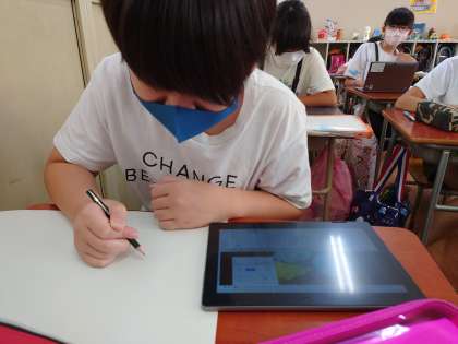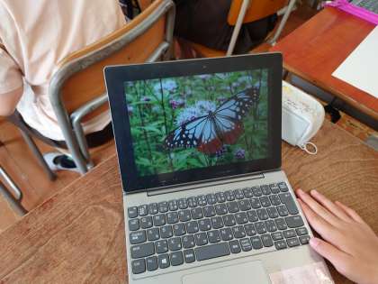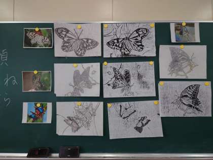 5年生が図工をしていました。。ふしぎなチョウというタイトルです。タブレットでチョウを探して、お気に入りのチョウを見つけていました。版画に仕上げるようです。