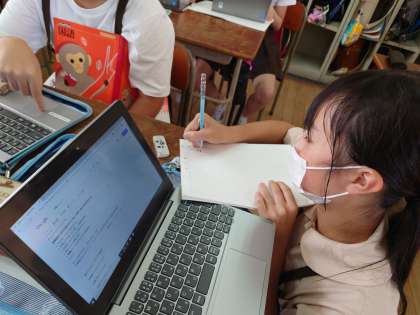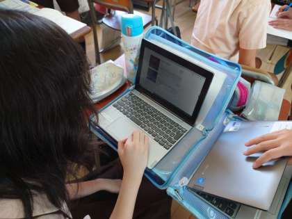 6年生がタブレットを使って国語をしていました。沖縄と北海道のメリット、デメリットを調べていました。