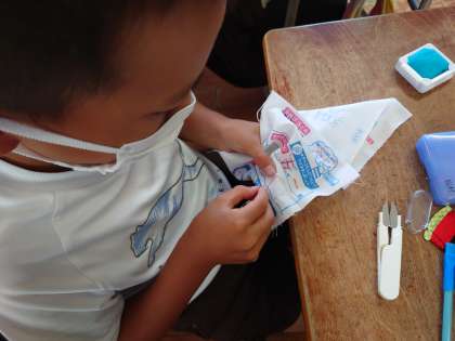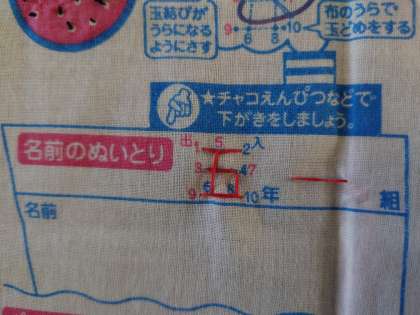 5年生が家庭科をしていました。五年一組名前を赤い糸で縫い取りの練習をしています。