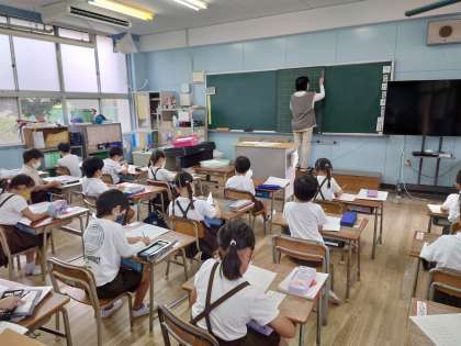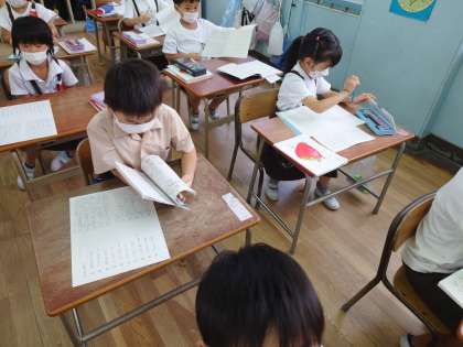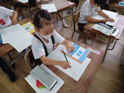 1年生、隣のクラスも音読のあと漢字ドリルを見て、ノートに書くようです。