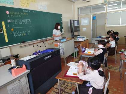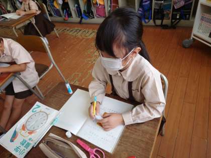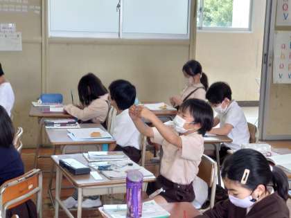 2年生が算数をしていました。直角を学習しています。定規や、ノートなどここも直角だねと理解していました。