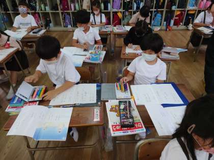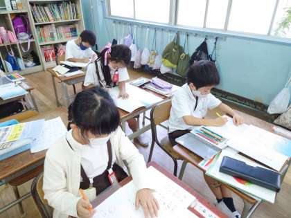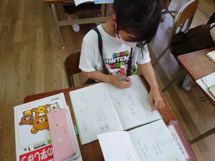 1年生が視写をしていました。書き終わると挿絵のシャボン玉をかいていました。