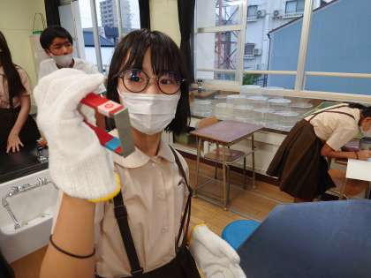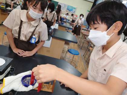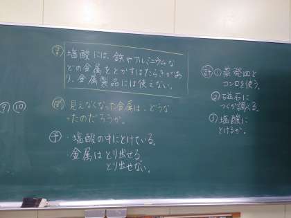 塩酸に溶かした鉄やアルミニウムを加熱し、蒸発皿に残った粉を磁石につくか調べていました。ちなみに鉄は写真のようにつきます。この粉が元の鉄のようにくっつくかどうかを調べています。