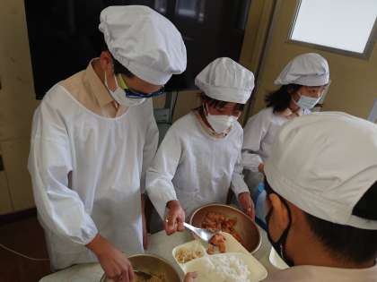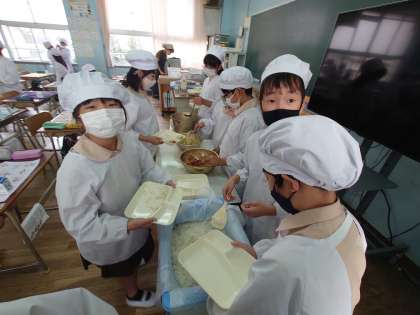写真を撮っているとある児童が「先生、ラー油ってどれくらい入っているの」と聞いてきました。ピリ辛好きなようで学校では程よくピリ辛だよというと、残念がってました。