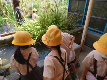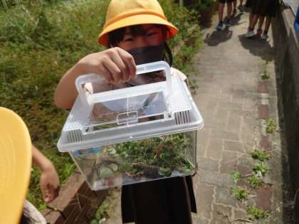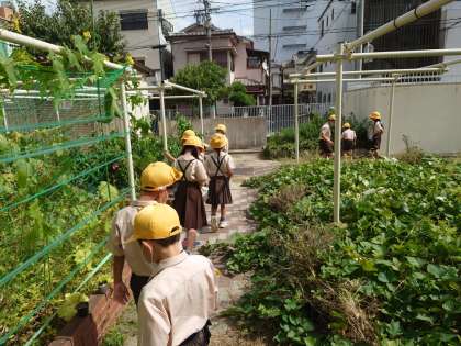 1年生が学習園にいました。秋の生き物を探しているようです。