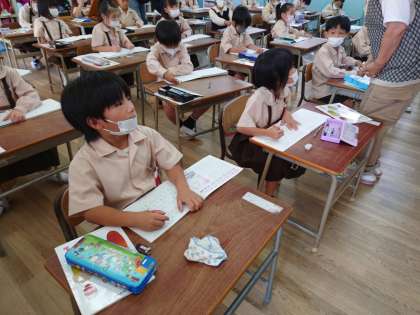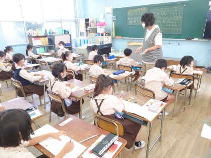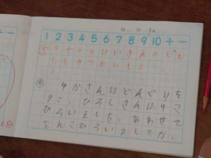 1年生が算数をしていました。9+4の計算です。繰り上がりの学習、10のまとまりを作って考えていきます。