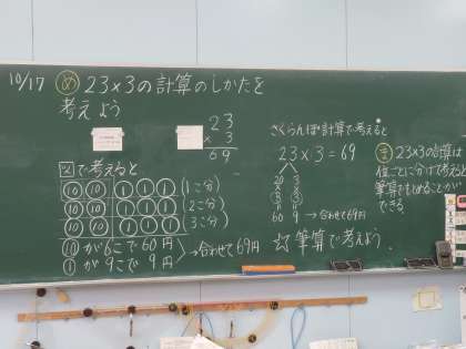 3年生が算数をしていました。23?3の筆算の仕方を考えていました。