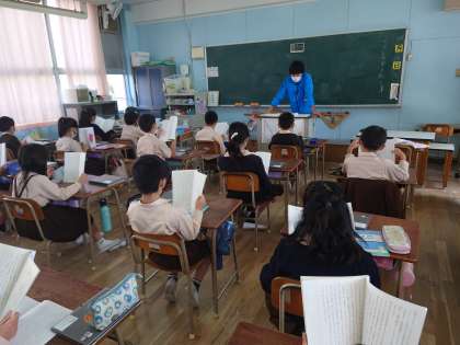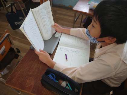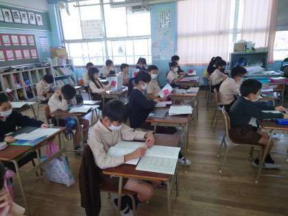 4年生が国語をしていました。暮らしの中の和と洋の単元です。音読後、今からタブレットで調べ学習が始まるようです。