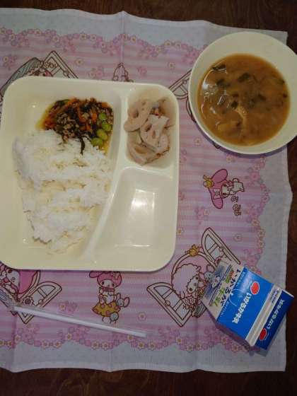 ジューシーとは沖縄県の言葉で炊き込みご飯を指すそうです。給食ではもずくと豚ひき肉、にんじん、枝豆が入っています。
