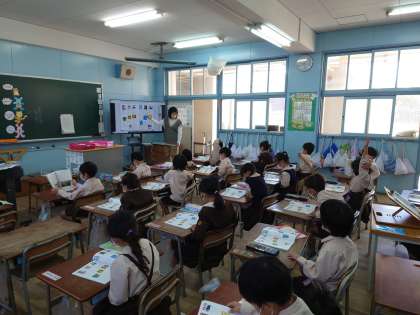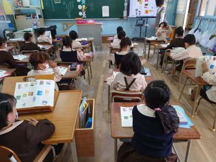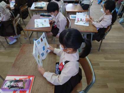 1年生が国語をしていました。本はともだちという場面でした。図書室でたくさん読んでいるので、どんどん本に興味を持って欲しいです。