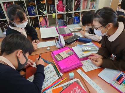 5年生が国語をしていました。和の文化をうけつぐという単元で、タブレットを使って調べ学習をしています。着物や和ろうそくなど班ごとに調べています。
