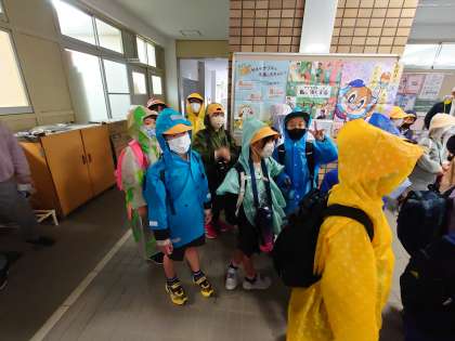かっぱを着てキッズプラザに向かいます。