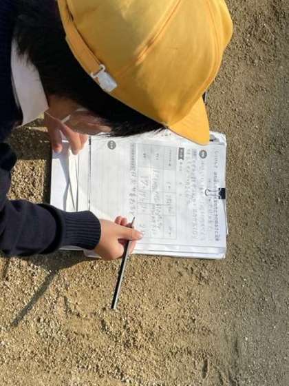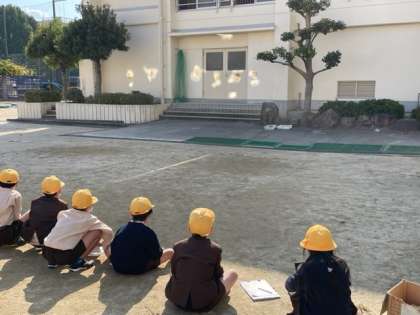 グラウンドで、鏡を使って光の性質の実験をしていました。その中で、反射させた光を集中して、温度がどれくらい上昇するか走って確認しているところです。他には、光の道筋の確認もしていました。