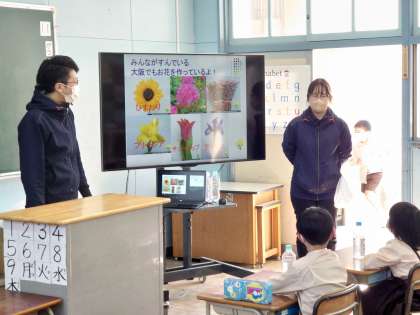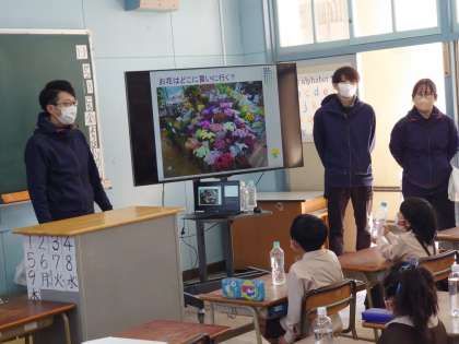 鶴見区にあるなにわ花いちばさんが来られて、一年生が出前授業を受けていました。