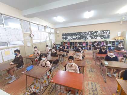今日は雨はあがっているのですが、運動場のコンディションが悪いので放送朝会でした。
