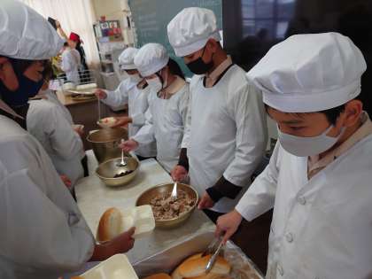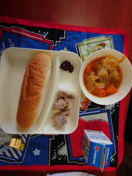 ケチャップ煮は玉ねぎ、キャベツ、人参、グリンピース、じゃがいも、鶏肉と具だくさんです。