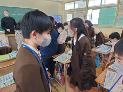 6年生が英語をしていました。二人で相談して色々な仕事でできることを書いている英文からその仕事を推測していました。