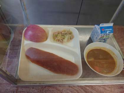 カレー煮は肉団子が入っています。野菜は人参、玉ねぎ、大根など具だくさんです。