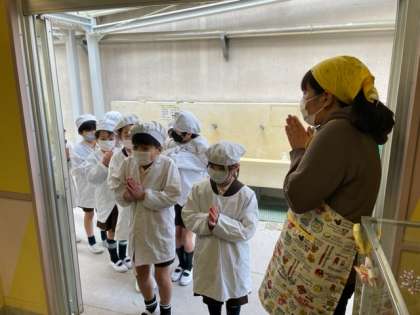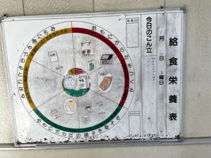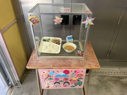本日の給食は、豚肉のごまだれ焼き、みそ汁、きくなと白菜のおひたし、ご飯、牛乳です。