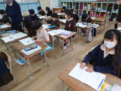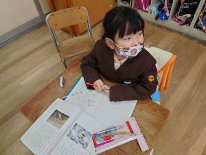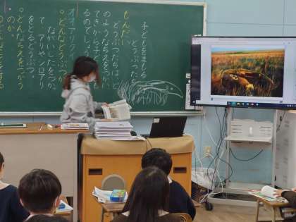 1年生が国語をしていました。文章とオオアリクイの絵をかいていました。