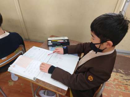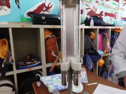 今日の2年2組の室内は14℃だそうです。少し寒いです。二酸化炭素は400ppm少しということで大気の量とほぼ変わらないそうです。湿度は46%。規定の30%を超えているといいとのことで、エアコンをつけてはいますが湿度も十分だそうです。