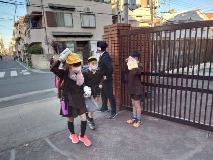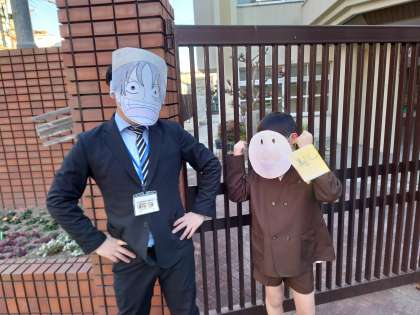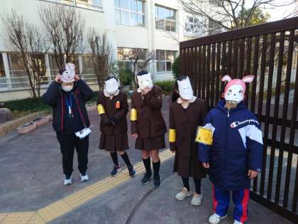 月曜からあいさつ週間が始まっています。代表委員会のメンバーが校門でお手製のマスクをかぶって元気に挨拶していました。来週の金曜までです。