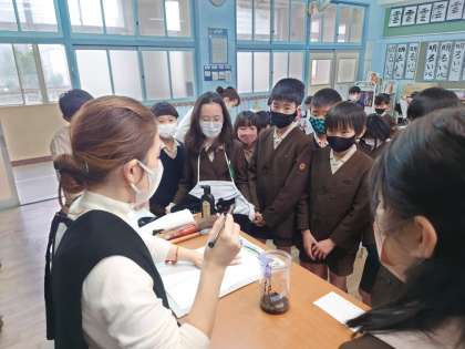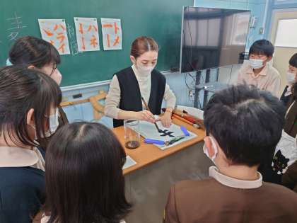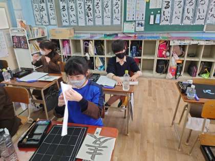 4年生が出前授業をしていました。地域の書道教室の先生に来ていただいて麦という字を書くようです。