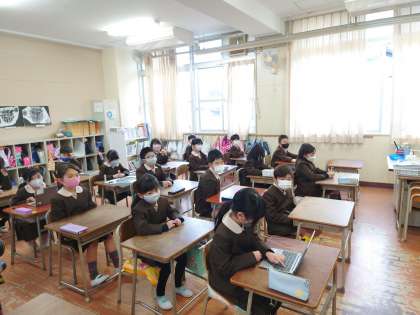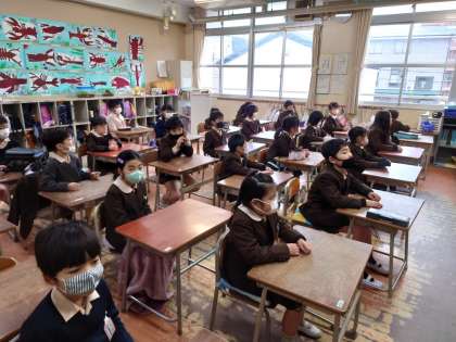 今日は運動場に水が浮いていたので放送朝会でした。