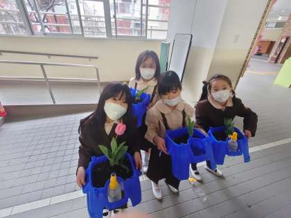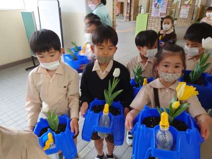 1年生が入学式にチューリップでお出迎えするため鉢を講堂前まで運んでいました。もう咲いているものもありました。